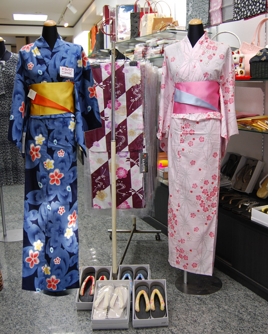 仕立て上がり大人浴衣(男女共)が半額で4,100円〜8,950円まで、どれも一万円以下です。 色・柄とも多数取り揃えております。お買い上げの方には、着付けを一回サービスいたします(要予約)。また、下駄・巾着等も多数取り揃えております。